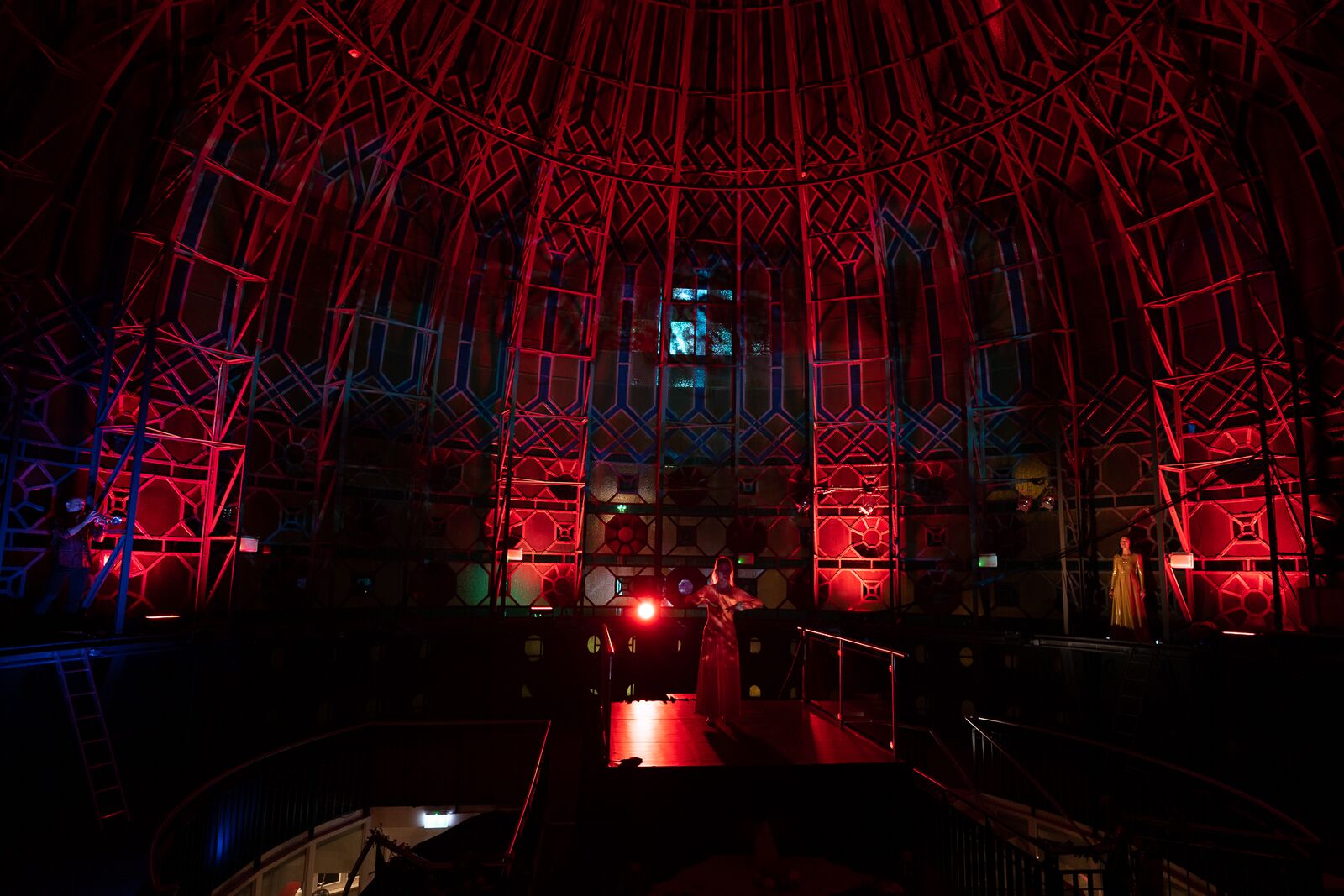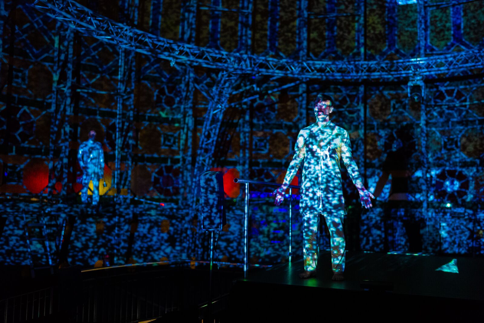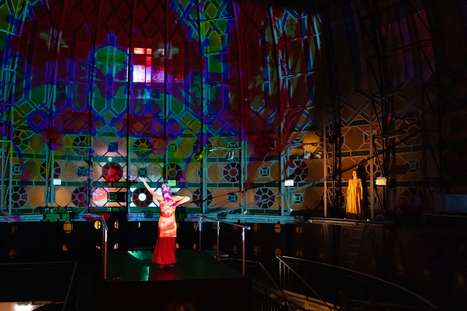 In IMMERSION trafen der italienische Gastkünstler und Tänzer Paolo Cingolani, das Dresdner Performance-Ensemble Atmadhvani und der Medienkünstler Jo Siamon Salich zusammen und tauchten in die architektonische Besonderheit des Gebäudes der Yenidze ein – multimedial, immersiv und interaktiv.
