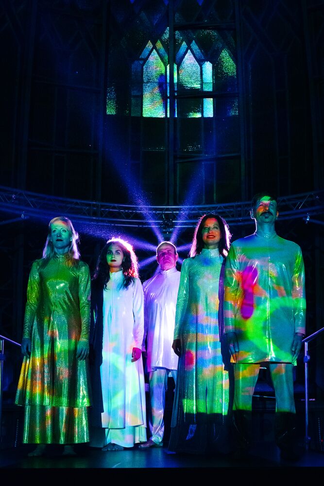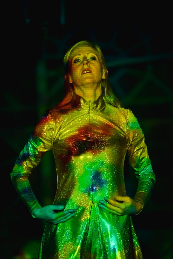 Die Künstler:innen von Atmadhvani schafften erstmalig zusammen mit Medienkünstler Jo Siamon Salich ein einzigartiges Gesamtkunstwerk aus interaktiver Projektion, Grafik, Sounds und Performance.